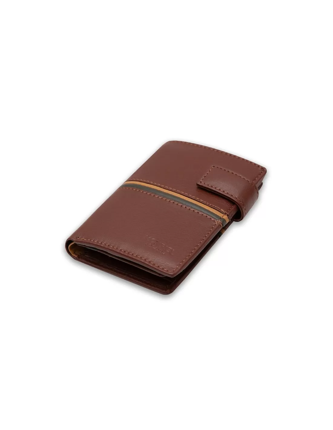 Cartera elaborada en piel para hombre. Disponible en dos tonalidades: habana y marrón. Es un diseño clásico pero original gracias a sus dos rayas de color en tono verde y cuero. Contiene broche para mayor seguridad, un doble billetero, monedero y con capacidad para 8-10 tarjetas.