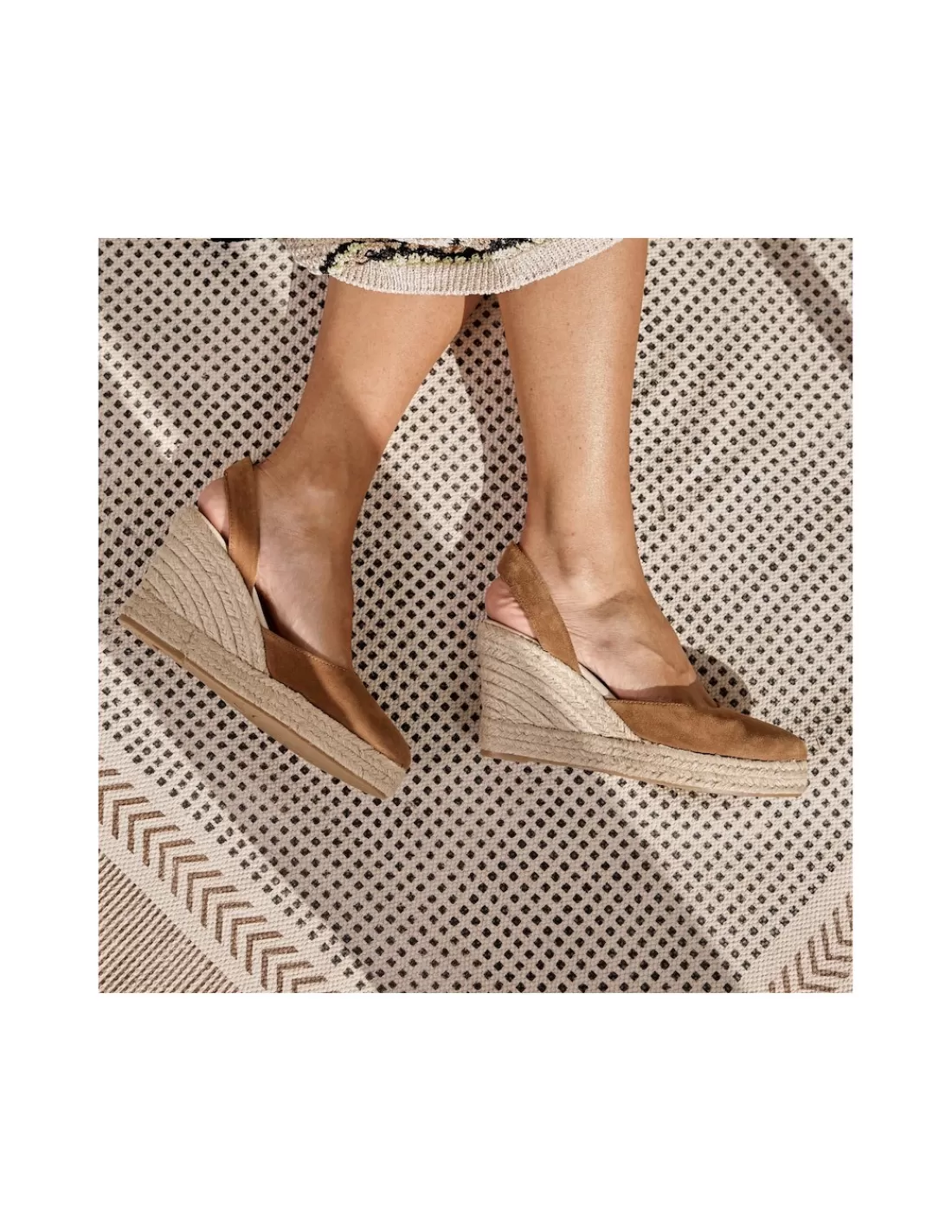Cuña de yute de 9 cm, plataforma de 2cm fabricada en piel. Puedes encontrar esta nueva alpargata en piel tono nude y si eres más atrevida la versión metalizada perfecta para realzar tanto tu look como para una ocasión especial de las noches de verano. Ahora en serraje cuero y serraje negro.