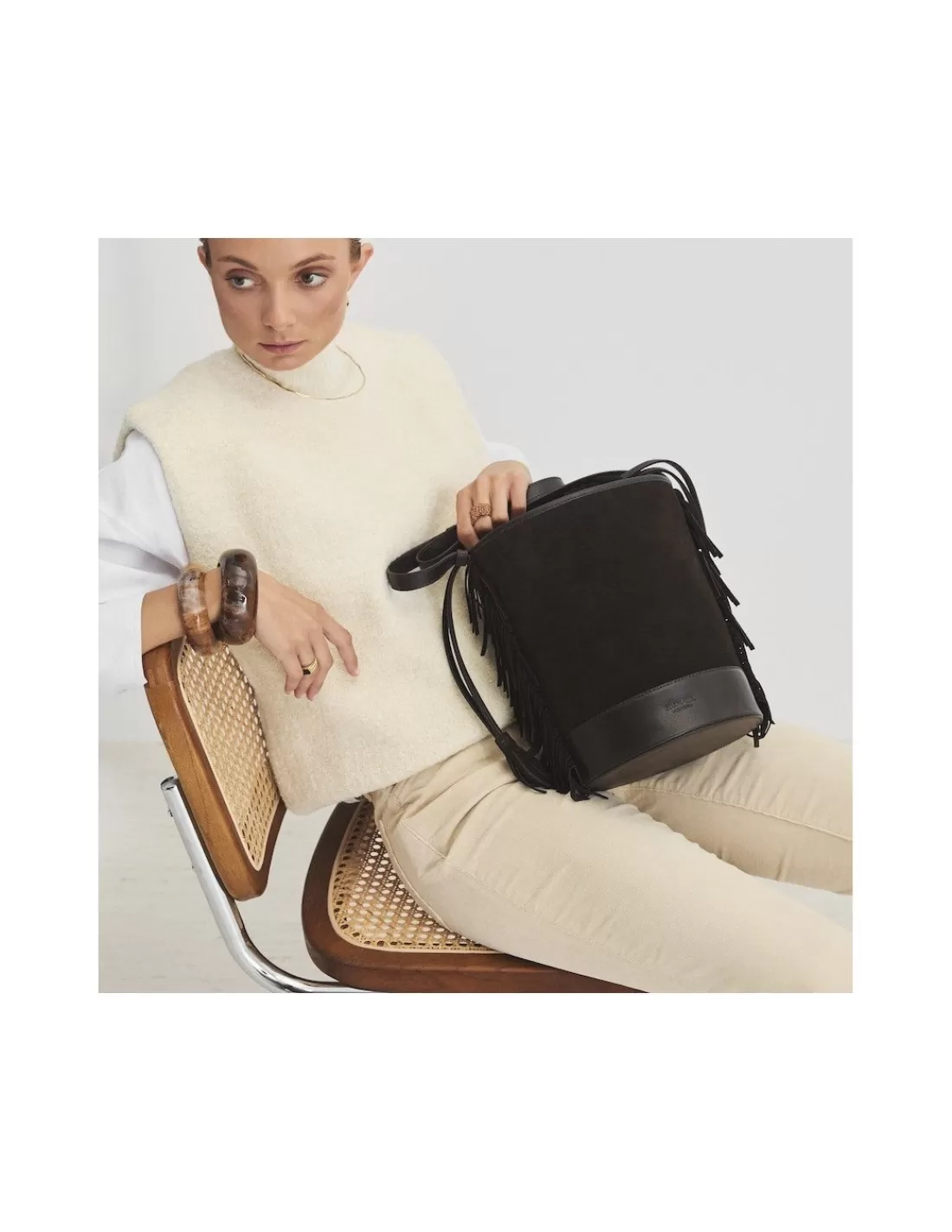 Nuestro icónico bolso de cubo viene esta temporada pisando fuerte, esta vez en versión “fringe”. Bolso de cubo grande, de cuero, hecho en piel por nuestros marroquineros con un especial detalle de flecos de piel de serraje en sus laterales. Estos flecos dotarán de movimientos a tu bolso allá donde vayas. Redescubre el clásico bolso de cubo con un toque de bohemia contemporánea. El bolso está diseñado para ser tan funcional como estético. Su forma única y los flecos dinámicos lo convierten en el complemento perfecto. Disponible en color cuero, negro y marrón serraje, además de ser personalizable. ¿Quieres darle un toque especial?