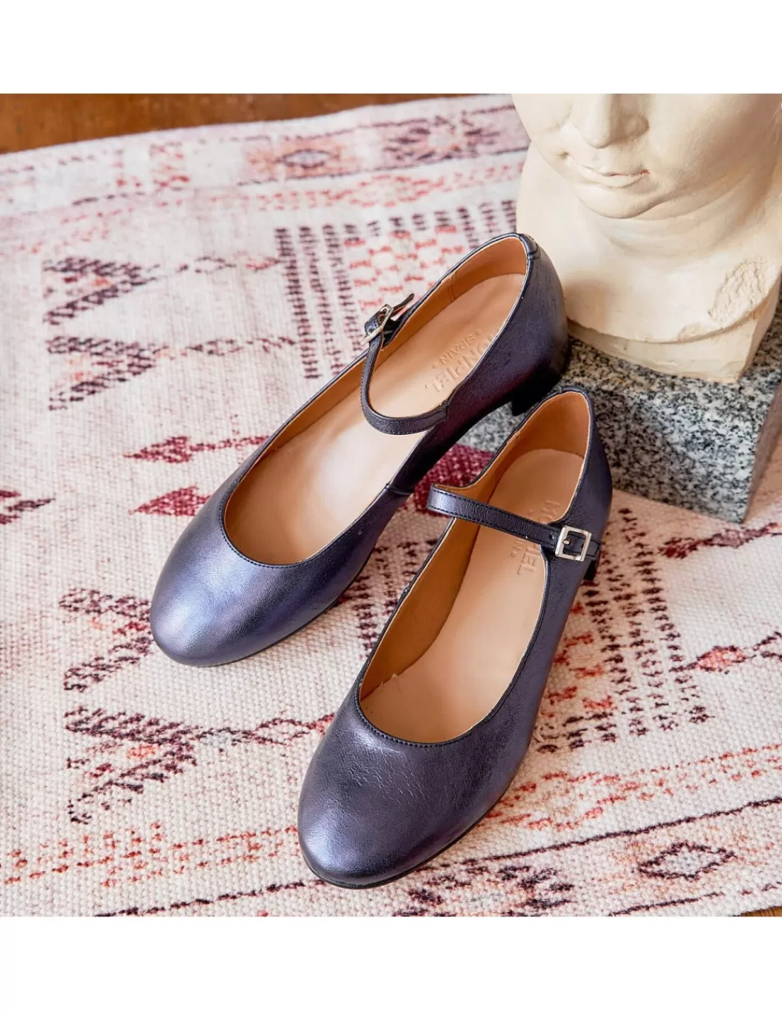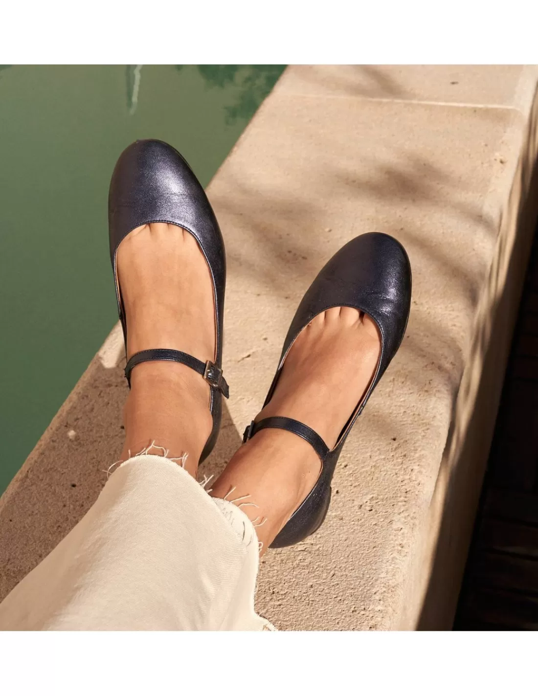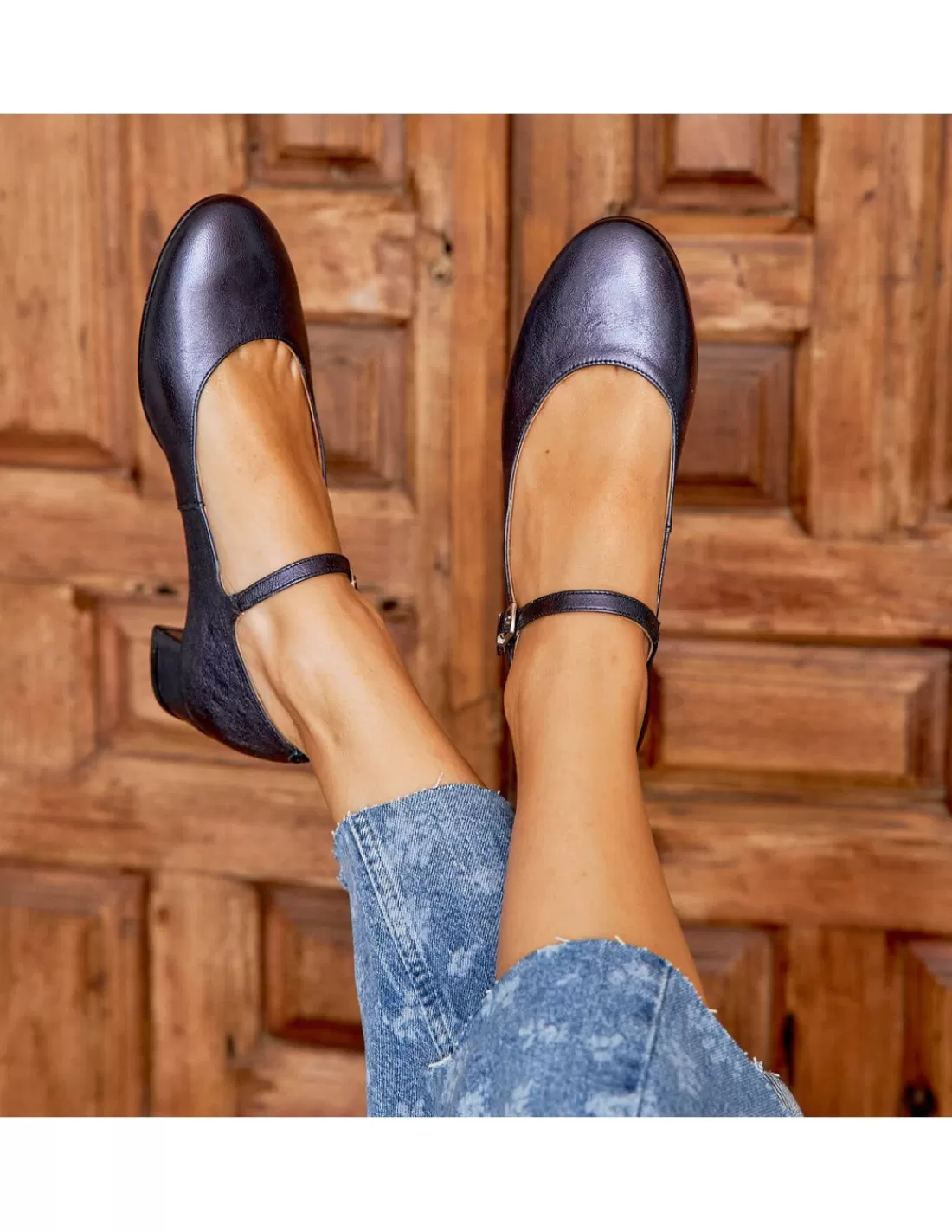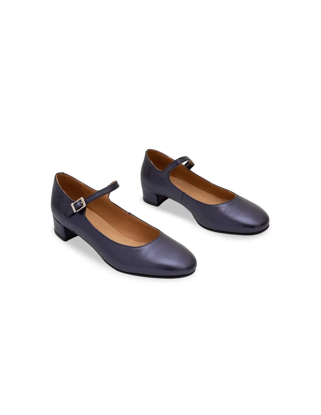 Zapato mercedita Charlotte elaborado en piel 100% natural. El nuevo modelo de mercedita de piel, es Charlotte al más puro estilo francés y retro, inspirado en el modelo Mary Jane del ilustre zapatero español Manolo Blahnik. Esta mercedita dará un estilo sofisticado a tu look con un toque muy femenino y chic. Elaborado en una piel suave súper cómoda, adaptándose a tu pie como un guante. Tacón medio cuadrado de 3,5 cm muy cómodo. Combínalo con tus jeans favoritos o con un vestido y cómete el día! Disponible en un color muy especiales: azul metalizado.